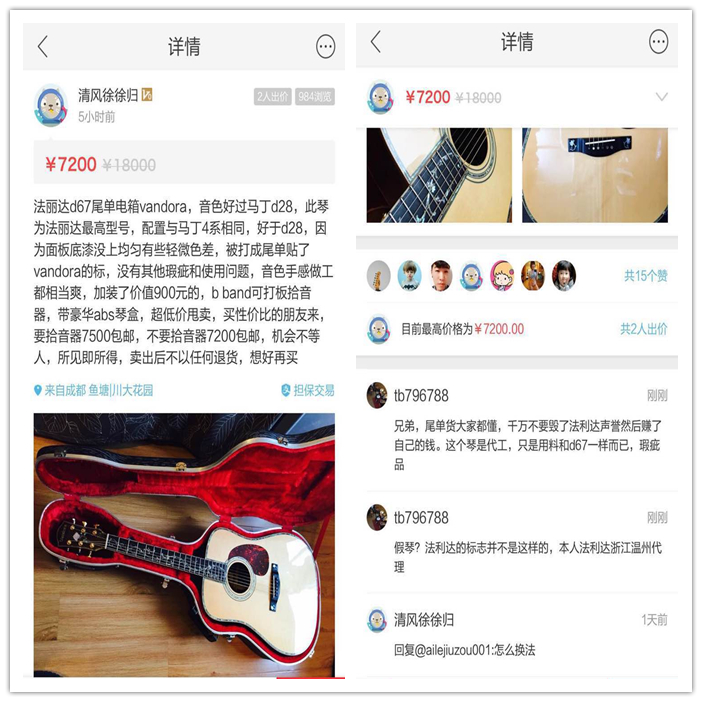 【法丽达在线讯】最近,一支长相酷似法丽达D-67的吉他被晒到了二手交易网站上,这支吉他在琴头和下驹两侧都镶上玫瑰的花式,并指明该琴因质量问题被法丽达贴成尾单,这种行为是对法丽达品牌形象的一种损伤!