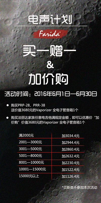 活动期间,凡购买法丽达家族电吉他满规定金额,即可以优惠价格“加价购”Vaporizer 全电子管音箱(原价3680元)1个,购买PRP-28、PRR-38,则无需加价,可免费获赠音箱一个,详情可见下图: