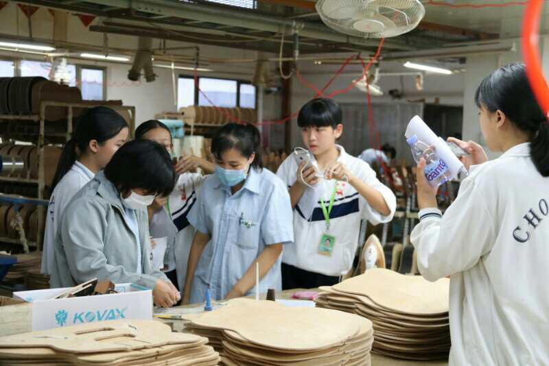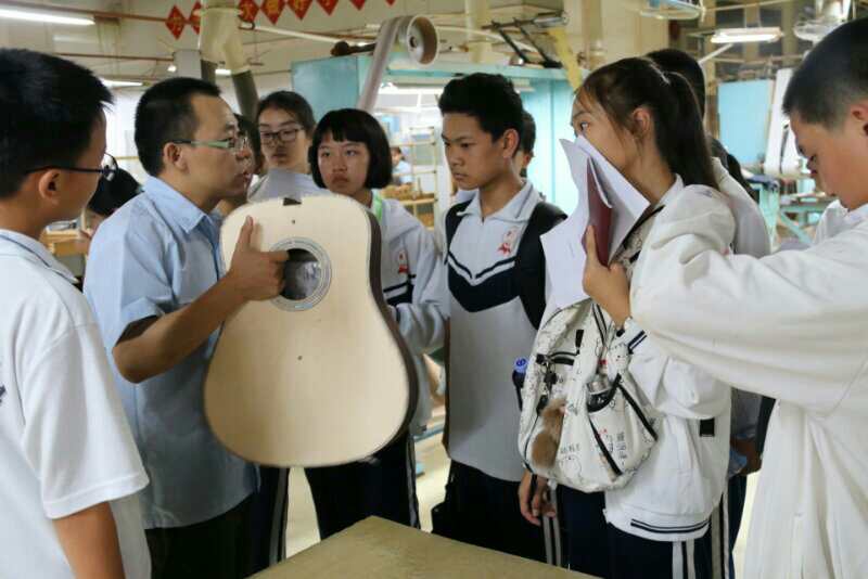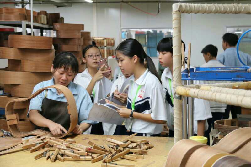 本次“探访吉他文化助力吉他之乡”为主题的科技实践活动让同学们走进全丰吉他乐器厂,刚步入厂区,同学们就难掩心中的激动;走进生产车间,工厂师傅们耐心的讲解,让同学们不断做着笔记,看到、听到精彩处还拿起手机拍照留念。
