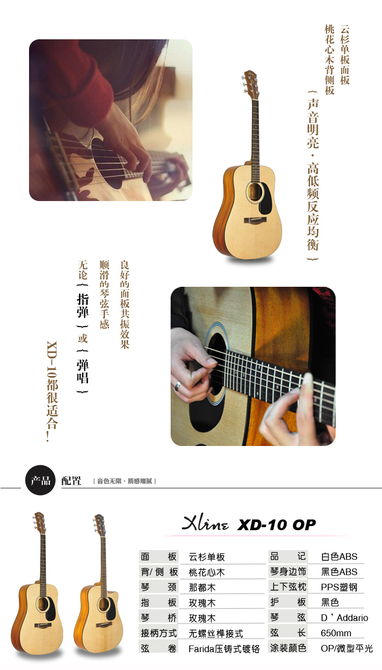 XD-10是一款忠实于木材原始特征的吉他,OP微型平光涂装让木材凹凸细腻的纹理清晰可见,声音通透明亮,手感顺滑舒适,上市以来好评不断,被冠以“新手利器”,“会呼吸的面单”等名号。双十一当天原价1800元,当天限时优惠价仅售1620元,法丽达成熟制琴工艺荣耀出品,官方淘宝店铺诚挚推荐。
