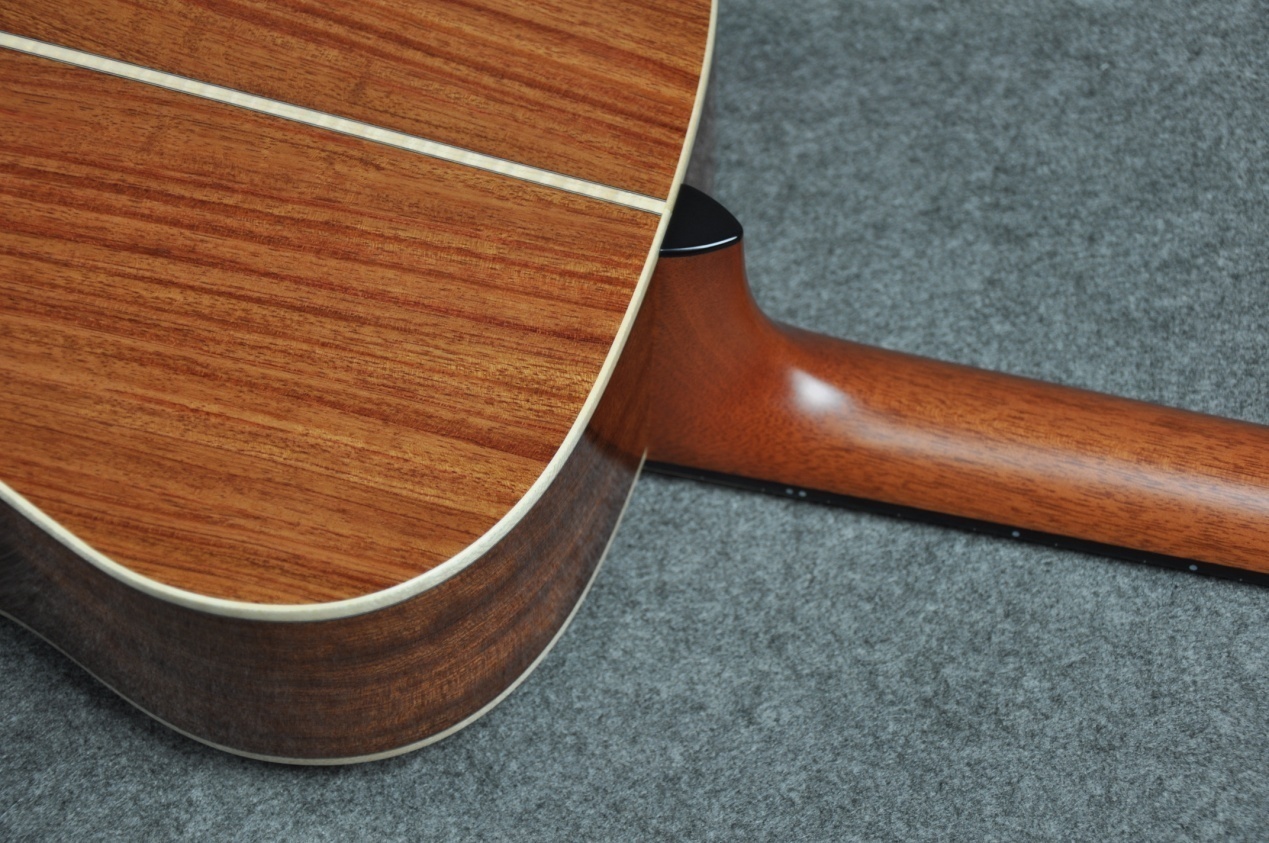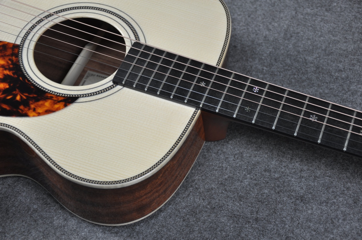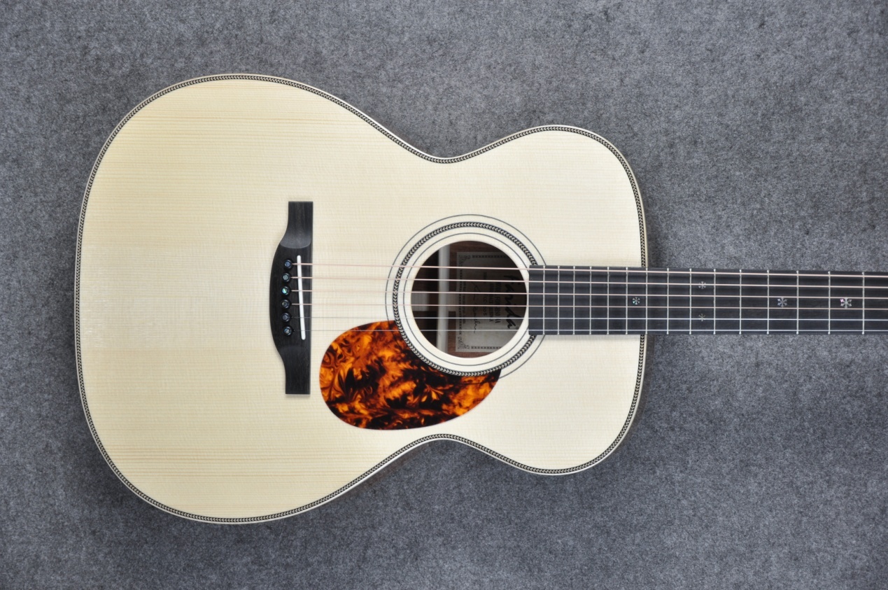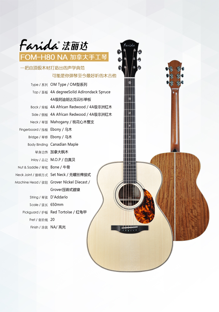 FOM-H80NA是一把由顶级木材打造出的声学典范。她的华美圆润音色不仅源自制作时优选的高等级木材,还因不同木材之间的和谐搭配和制琴技艺的巧夺天工。经验老道的制琴师深知非洲红木背侧板与40寸OM桶身能产生出神奇的音乐化学反应, 4A级阿迪朗达克云杉单板面板搭配整支桃花心木琴颈造就了她极其均衡且清晰的音质。包容万千的声音让轻拨弦线或大力弹奏均能做到张弛有度,美轮美奂的天籁音色让听者和弹者都能享受到音乐之美。