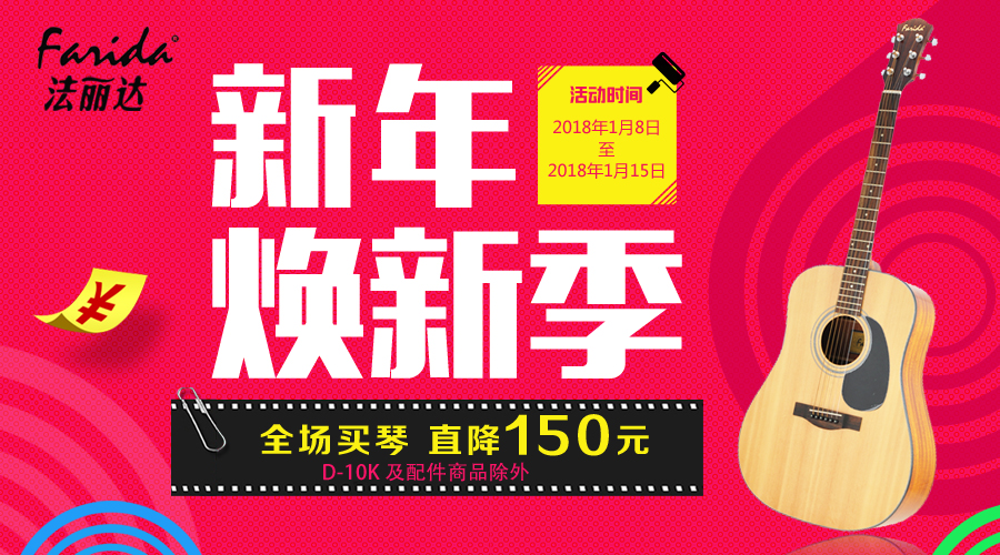 新的一年,你的吉他年度计划又是什么呢?万事俱备只欠好琴,不管你处在以上哪个阶段,都需要一把吉他来正式开启你的年度计划。为此,法丽达吉他展开新年焕新季活动,送上全场通用的150元优惠券(D-10K及配件商品除外),祝你心想事成,圆梦2018。