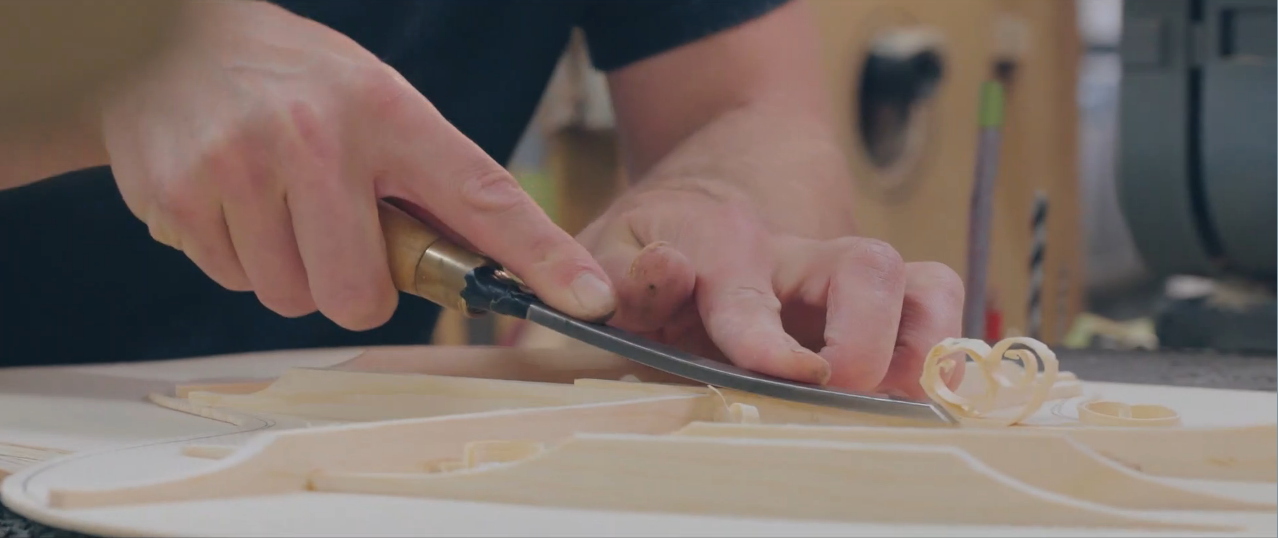 生长在世界最大的阿迪朗达克森林生长着的原木随着伐木工的电锯轰然倒地,加拿大Boucher吉他资深制琴师在无数块木材中相中品相完美的一块, 琴师切削、打磨、雕刻精心打造出制作吉他最佳的材料,繁杂的工序结束后郑重在杰作的标签上写上自己的名字,标志这把实用性艺术品的诞生。