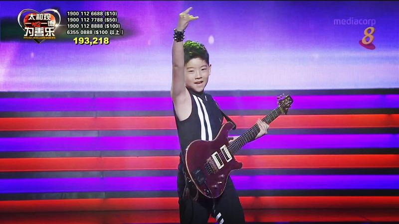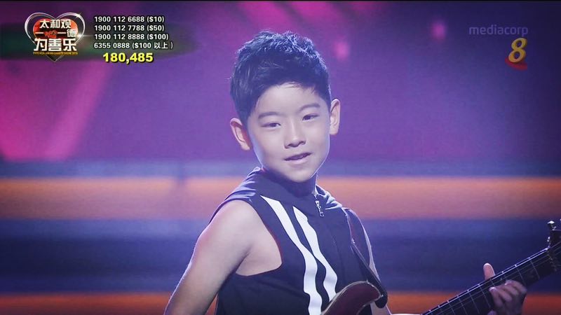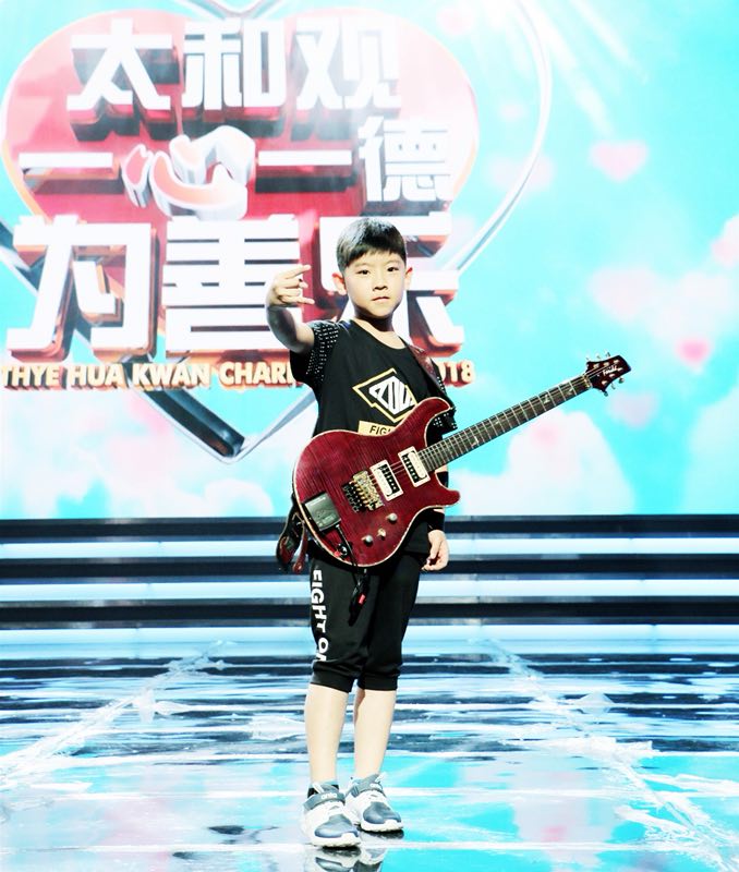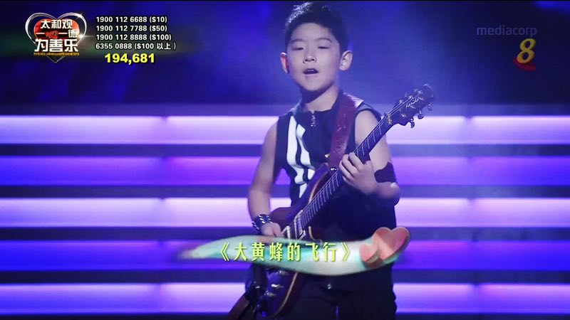 【法丽达在线讯】近日,谢豪受新加坡国家电视台邀请参加《太和观一心一德为善乐》慈善直播晚会,与众多知名艺人一同为慈善筹款。作为本次晚会最小的表演嘉宾,他持法丽达电吉他表演了《大黄蜂的飞行》,还上演了一出反手弹琴的拿手好戏,引发热烈的反响,共筹得27720通电话,在当晚拔得头筹!
