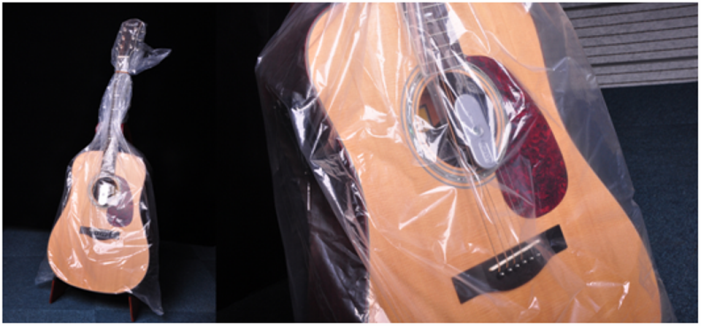 以全单琴D-52 为例,放入加湿器时,务必放松琴弦。标准音下反向旋转一圈半为佳。过松的琴弦也会造成琴颈弯曲。塑料袋包装完毕,用橡皮筋密封整个加湿环境。