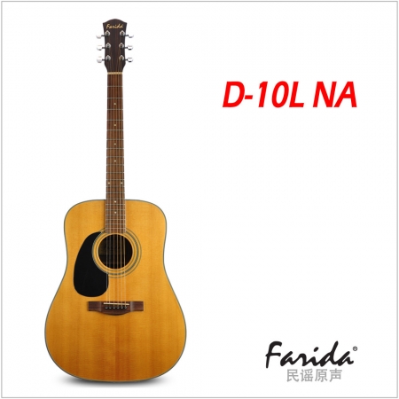 D-10 L 是 Farida 特别为了习惯使用左手演奏的乐手所开发的表面单板民谣吉他,规格与 D-10 相同,面板选用了高级的单板西提卡云杉,搭配上桃花心木为背 / 侧板,超值的价格与工艺,极适合左手弹奏的乐手选购。