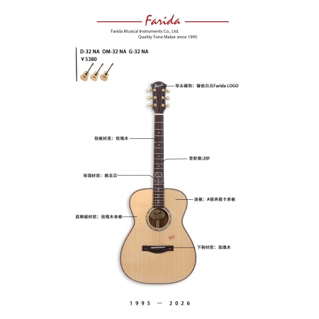32系列是法丽达为追求卓越的演奏者准备的进阶全单系列,提供D桶、OM桶与GAC桶三种经典桶形,官方售价5380元。我们精选更高等级的木材,更精细的声学,让每一把琴都成为能深刻表达音乐情感的共鸣伙伴。